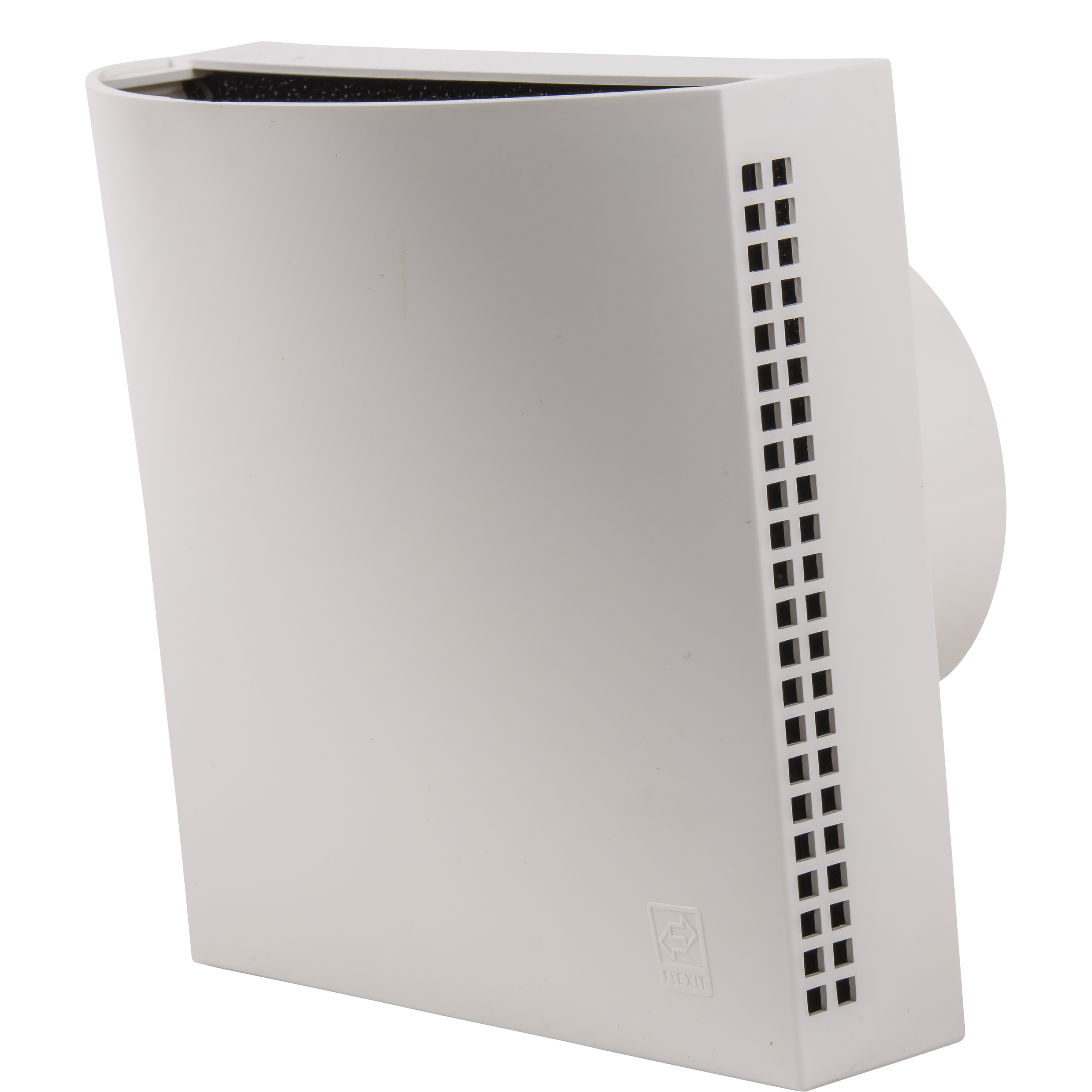 Flexit innvendig ventil Aero med rund stuss. Med filter, trinnløs regulering av luftmengde og kondensisolering. For montering i vegg. Monteres i soverom, oppholdsrom eller andre områder med behov for ventilasjon. Anbefalt plassering er høyt på veggen og helst over en varmekilde ved gulv. Dette gir god komfort da stigende varm luft vil varme opp den friske tilluften som har lavere temperatur.